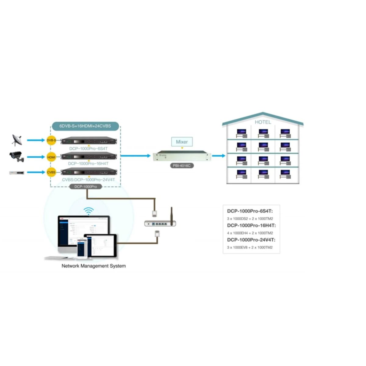 DCP-1000Pro - это цифровая головная станция от компании PBI (Китай). С использованием функциональных модулей она позволяет принять сигнал со спутника либо с эфира либо энкодировать видеосигнал и сформировать 4 смежные несущие DVB-C. Компактность в сочетании с полнофункциональностью делает её отличным выбором для небольших сетей кабельного ТВ, например в спорт-барах, больницах или гостиницах.