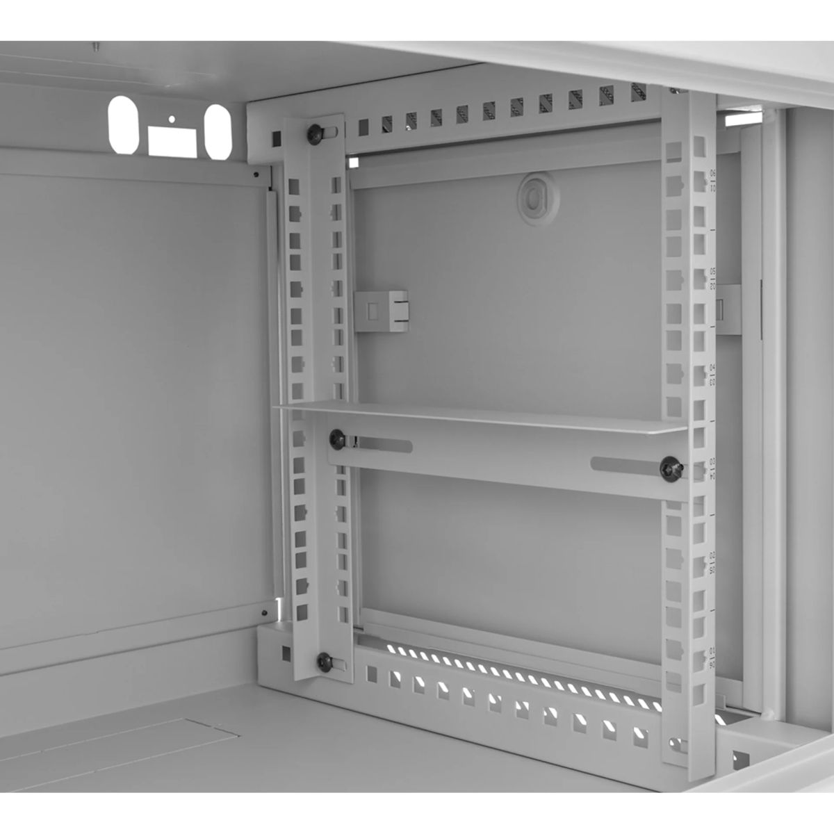 В комплекте идут монтажные вертикальные направляющие для крепления стандартного 19 дюймового оборудования. Направляющие пронумерованы в соответствии с количеством юнитов, для упрощения процесса монтажа. Направляющие регулируются по глубине. Доступ к оборудованию, устанавливаемому в шкафу, может осуществляться с трёх сторон. Шкаф поставляется в разобранном виде.