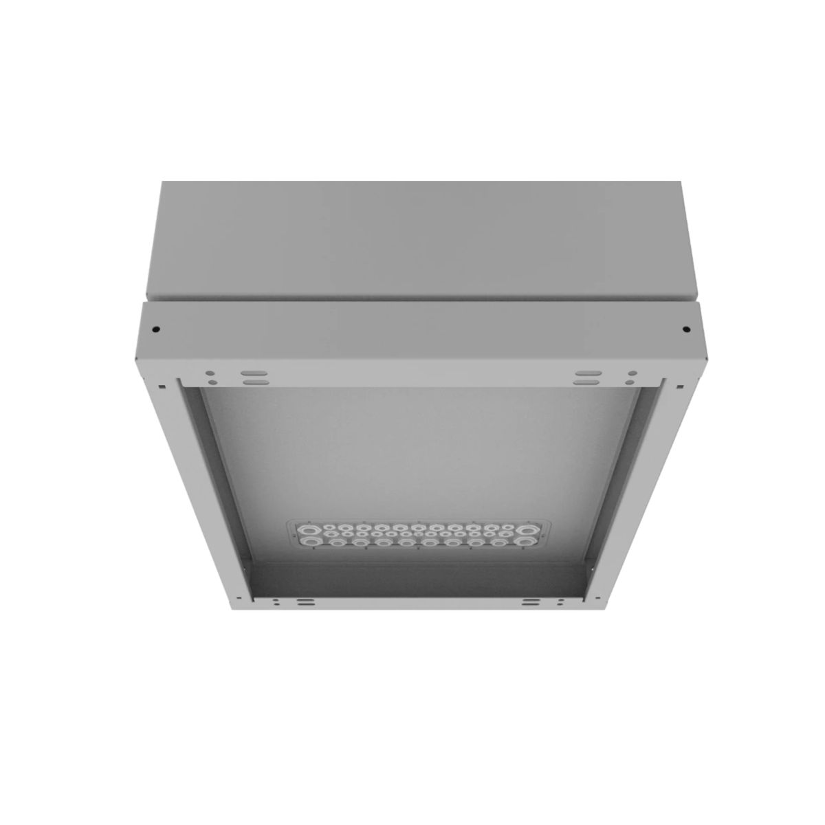 Корпус шкафа имеет сварную металлическую конструкцию, внутри покрыт термоизоляционным негорючим материалом. В основании шкафа предусмотрена съемная заглушка для ввода кабеля. Регулируемые по глубине 19'' направляющие толщиной 2 мм.