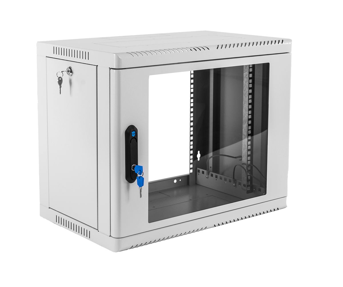 Шкаф телекоммуникационный настенный 19", 9U, дверь стекло, полезная глубина 300 мм, съемные стенки, распределенная нагрузка 200 кг, цвет серый, сварной, 479х599х359 мм.