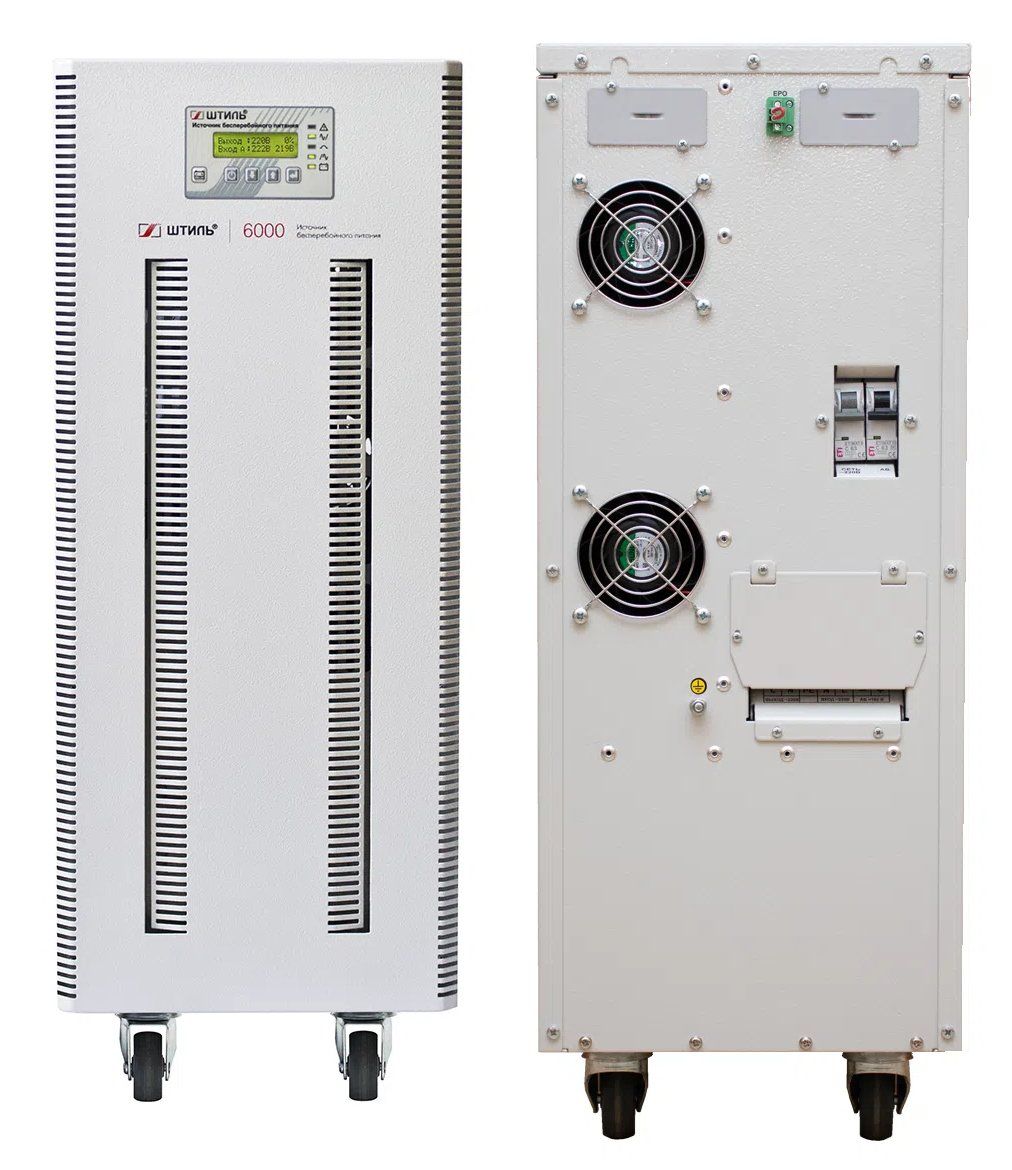 Источник бесперебойного питания напольный, on-line (с двойным преобразованием), чистая синусоида, 6000 ВA (5400 Вт); U-вх.220 В; U-акб.192 В, I-заряд.1…4 А, 16 батарей 12 В 9 А·ч; ЖК-дисплей; клеммное подключение (L, N, PE); холодный старт, совместим с генератором; IP20, t-раб.+5...+40°C, 660х250х572 мм