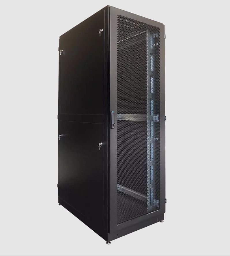 Шкаф телекоммуникационный 19'' напольный, 42U, передняя и задняя(двойная распашная) двери перфорированные, площадь перфорации двери 61%, ручка с замком, распределенная нагрузка 1200 кг, полезная глубина 855 мм, цвет черный, разобранный, 2048x600х1025 мм.