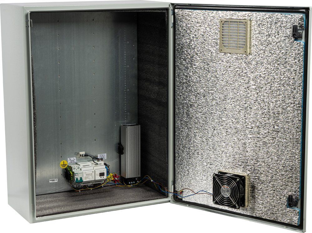 Шкаф металлический уличный утепленный с обогревом и вентиляцией; встроенный цифровой контроллер ЦКТ-01, термодатчика DS18B20; U-пит.170...250В, I-нагр.5 А, P-нагрев.150 В, вентилятор производительностью 55 кум.м/ч; выход "АВАРИЯ"; IP55, t-раб.-65...+50С, 800х600х300 мм, 27 кг.