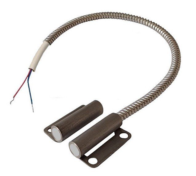 Магнитоконтактный для металлических поверхностей; контакты замыкаются при тревоге, 12 мм (контакты замкнуты), 7 мм (контакты разомкнуты); U-коммут. 200 В, I-коммут. 500 мА, P-коммут. 10 Вт; IP68, t-раб.-60…+85°C, габ.размеры 30х14х9 мм (геркон), 30х14х9 мм (магнит). Корпус из нерж.стали, кабель 600 мм