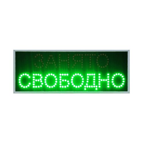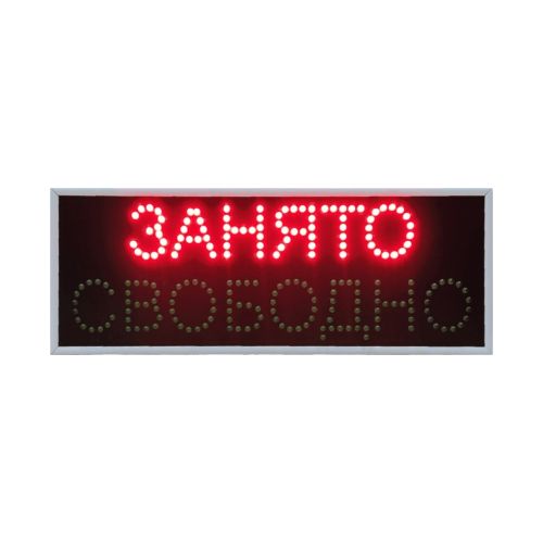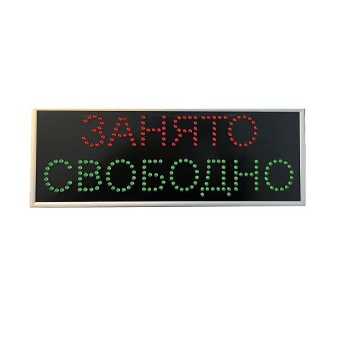 Табло оснащено яркими светодиодными индикаторами красного и зелёного цветов. Надписи «Свободно» и «Занято» переключаются с помощью проводного пульта.