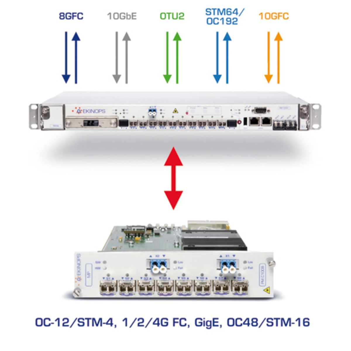 Ekinops 100G представляет собой переконфигурируемый транспондер/мукспондер, предназначенный для транспортировки сигналов 100 Гбит/с по существующим волоконно-оптическим линиям на значительные расстояния, в том числе и поверх существующих сетей.