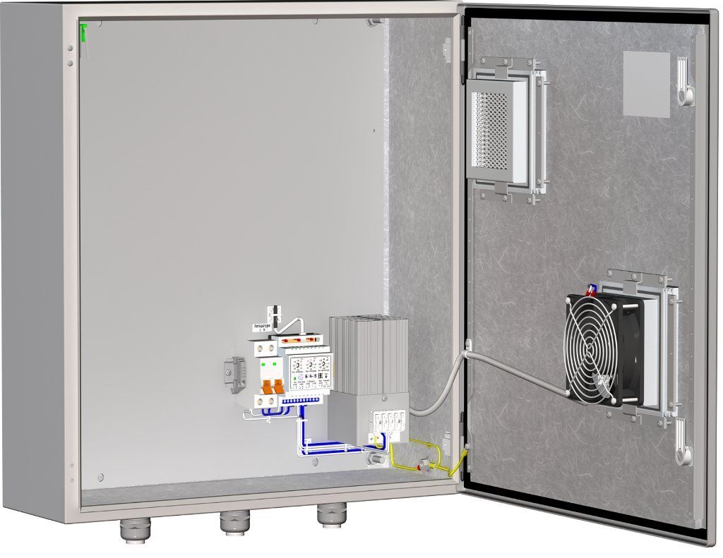 Термошкаф с вентилятором; AC 220 В; I-нагр.6 А(max); P-потр.118 Вт (обогрев); P-потр.18 Вт (вентилятор); IP55; -40...+50°С; 600х600х210 мм. В комплекте: блок управления климатом (БУК-5), обогреватель шкафов ОТШ-100, блок управления климатом (БУК-5В), вентилятор, тампер.