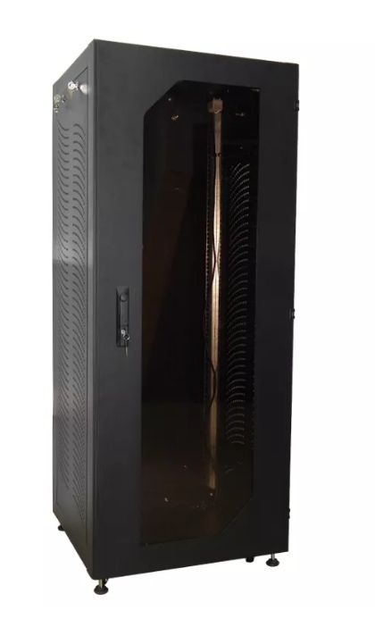 Шкаф телекоммуникационный 19" напольный; 32U; дверь стекло; угол открытия двери 180°. Габ.размеры: 600х600х1565 мм; полезная глубина 506мм; IP20; +1...+45°C; цвет: чёрный (RAL 9005). В комплекте: 8 полок регулируемых (400мм); 8 фальш панелей (1U); 2 блока розеток (8 гнёзд, 1U, 16А); вентиляторный блок с проводом и вилкой (220В/15Вт); термостат (тип NO) с кронштейном; опоры регулируемые (4 шт); анкера для крепления на стену; метизы; провода заземления.