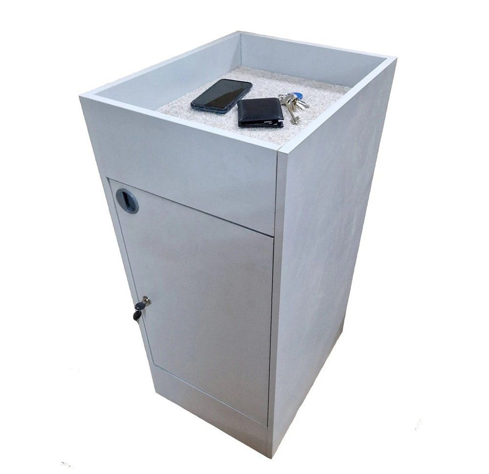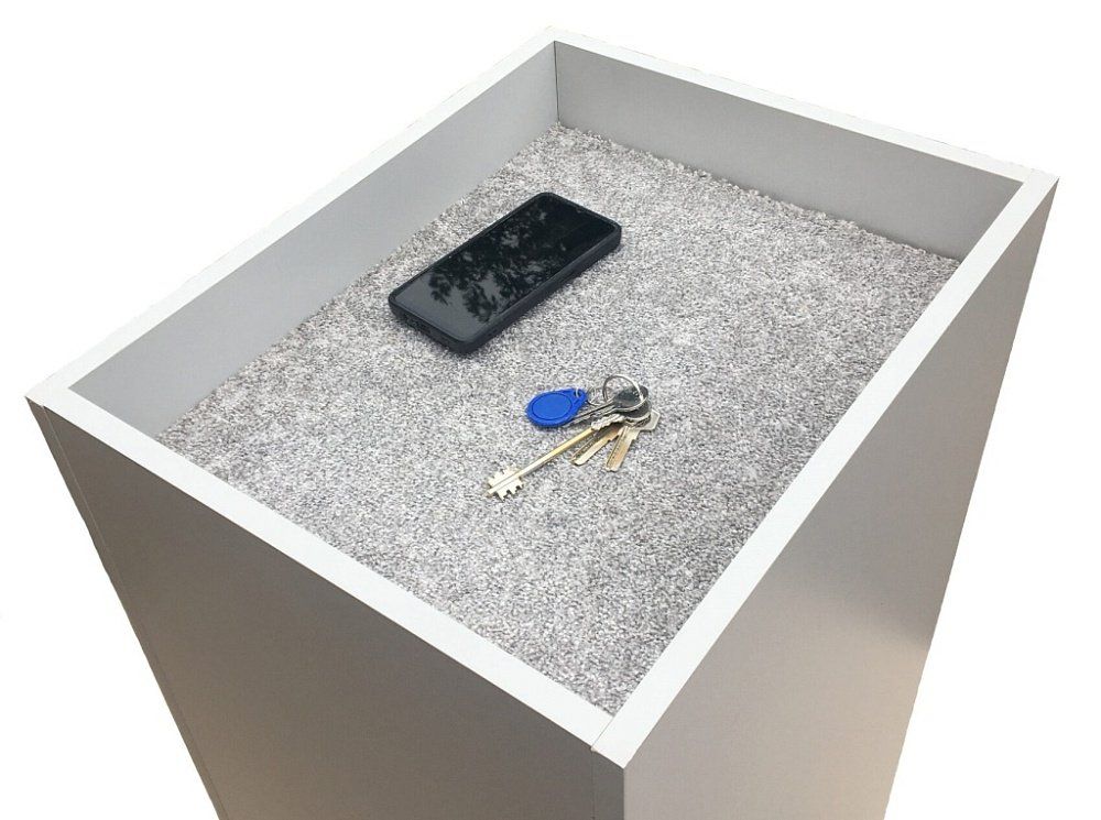 На тумбу выкладывают предметы, содержащие металл. Цель данной меры - исключить ложные срабатывания детектирующее оборудование. Наличие высоких бортиков исключает падение ценных вещей. Мягкая поверхность обеспечивает безопасное размещение хрупких предметов без риска повреждения.