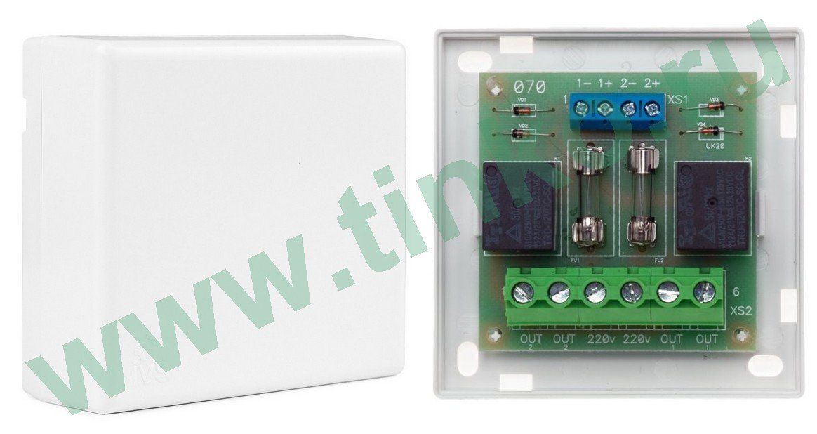 Устройство коммутационное; 2 реле с контактами на замыкание; U-пит.12 В, I-потр.25...40 мА; U-коммут.250, I-коммут.5 А; t-раб.-10...+50°С, 100.6х80.7х43.5 мм