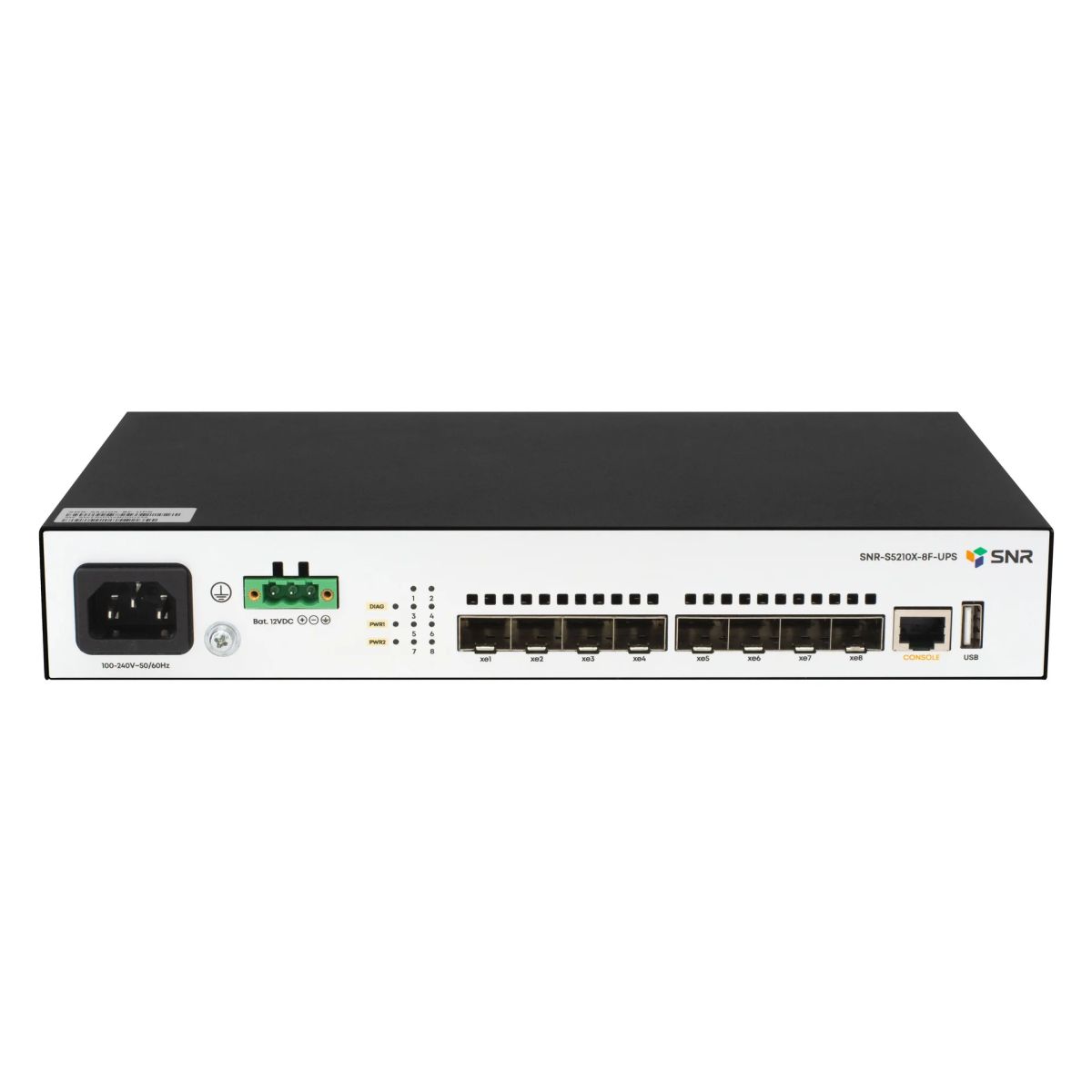 SNR-S5210X-8F-UPS имеет встроенный блок питания 90-264V AC, а также разъем для подключения АКБ 12V DC с возможностью заряда. Также внедрен функционал мониторинга подключения АКБ и основного питания, напряжения и тока заряда/разряда АКБ. Такое резервирование питания обеспечивает бесперебойную передачу трафика при отключении электроэнергии.
