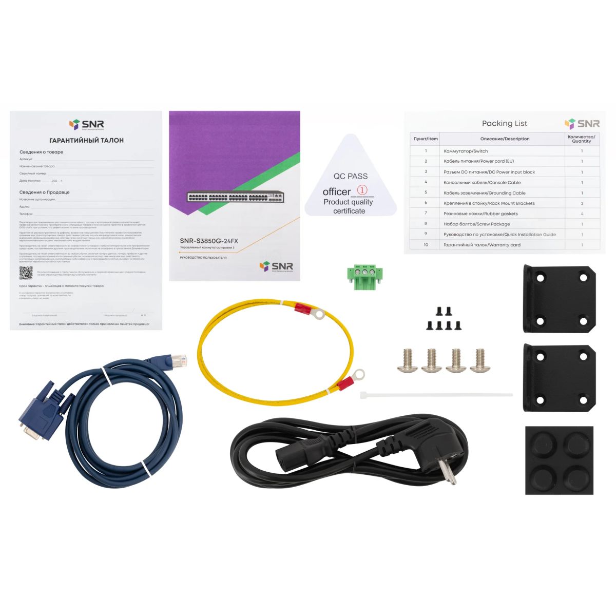 Коммутатор; Кабель питания; Разъем DC питания; Консольный кабель; Кабель заземления; Крепления в стойку (2 шт.); Резиновые ножки (4 шт.); Набор болтов; Руководство по установке; Гарантийный талон