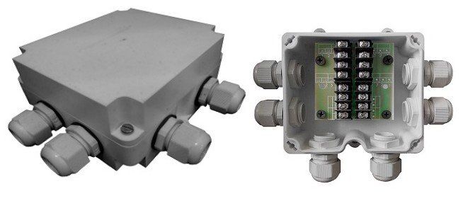 Конструктивно УСБ «СЕВЕР» выполнено в корпусе из пластика, устойчивого к естественному ультрафиолетовому излучению. Корпус изделия может быть оборудован герметичными пластиковыми кабельными вводами для подведения проводников диаметром от 6 до 12 мм* (*- по согласованию с заказчиком изделие может поставляться с пластиковыми кабельными вводами с диаметром подключаемого кабеля от 13 до 18 мм) или металлическими кабельными вводами серии МКВ из нержавеющей стали марки 12Х18Н10Т. Внутри корпуса изделия установлена печатная плата, на которой расположены винтовые клеммники Т31, DG3 или РМ2 для подключения соединяемых проводников сечением: Т31 - 2.5 мм2, DG3 - 1.5мм2 или РМ2 - 2.5 мм2.