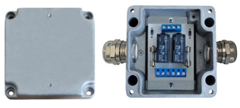 Блок релейный, 2 реле, контакты на переключение; U-упр.24 В; I-упр. <55 мА; U-коммут. до 250В; I-коммут. до 8 А; IP66/67; t-раб. -30…+50°С; габ.размеры 130х90х62 мм. Клеммник DG3, S² кабеля до 1.5мм², два металлических кабельных ввода ВМ20х1,5 (под кабель 6-12 мм)