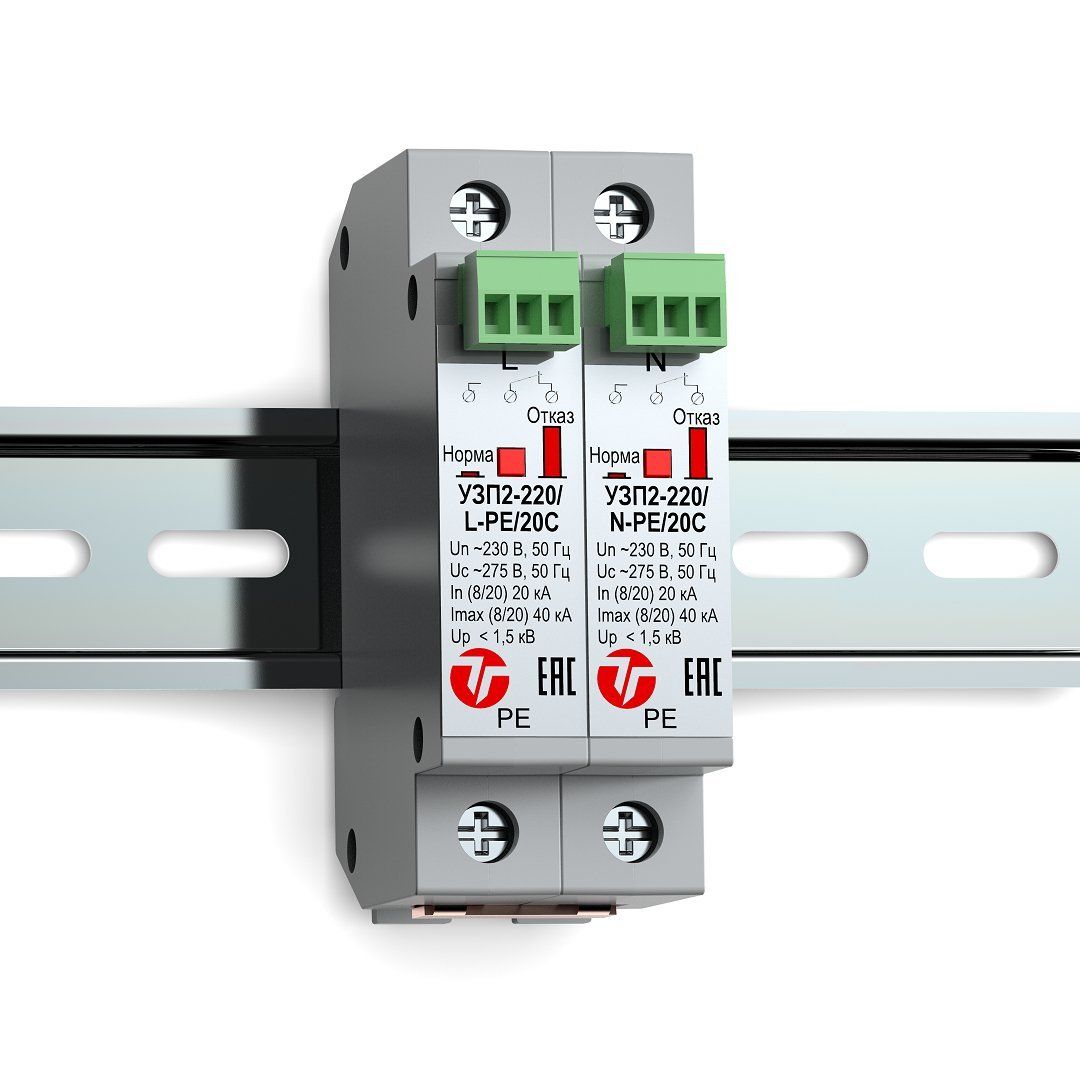 Устройство защиты электрооборудования распределительных сетей 220 (230) В AC от импульсных перенапряжений, комплект УЗП2-220К/LN-PE/20С предназначено для защиты оборудования, подключённого к линиям электропитания переменного тока 220 (230) В, от наведенных напряжений, вызванных электромагнитными импульсами высоких энергий (грозовыми, электростатическими разрядами и т.д.).