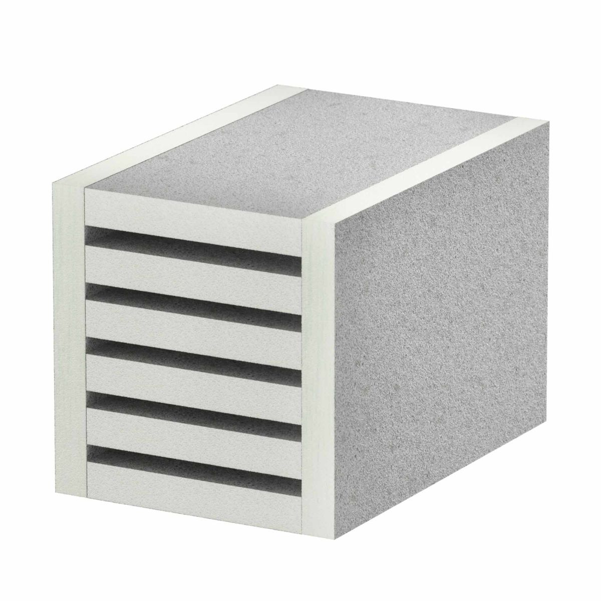 Материал вентблока - силикат кальция. Кроме того, в состав входит вспучивающийся материал, который при воздействии пожара образует теплоизоляционную пену, заполняющую собой вентиляционные отверстия
