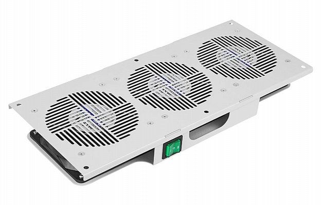 Вентиляторный модуль 19", 1U потолочный, 3 вентилятора с термодатчиком +35°С, глубина 176 мм, серый, AC 220 В, 60Вт, 44х400х176 мм.