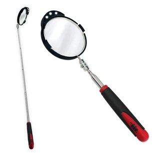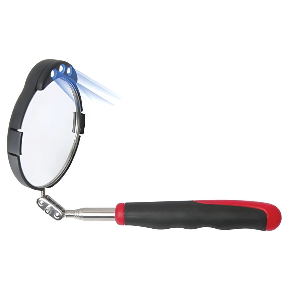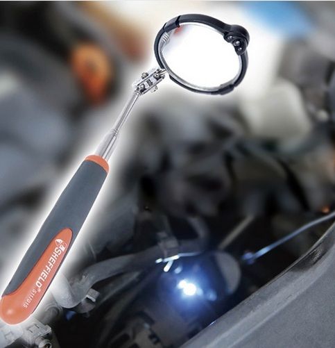 Наличие телескопической ручки позволяет варьировать длину от 17 до 80 см, благодаря чему возможно осуществление досмотра в самых сложных местах. Наличие светодиодной лампы делает процесс более эффективным в условиях плохой видимости. Досмотровое зеркало с подсветкой отличается следующими особенностями: