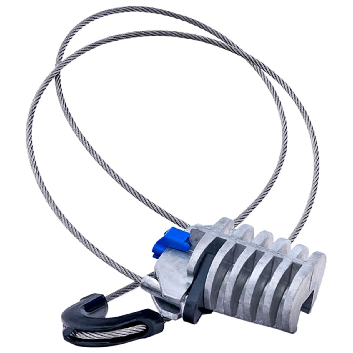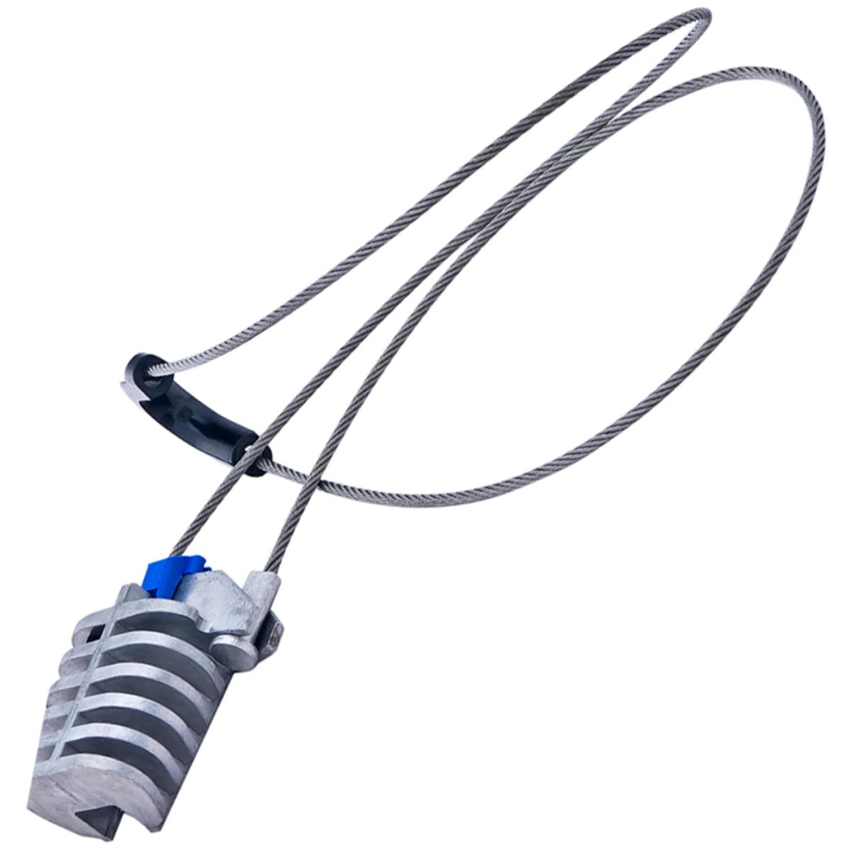 Анкерный зажим для подвеса оптического кабеля с несущим стальным тросом состоит из открытого конического корпуса, пары металлических зубчатых клиньев (зажимное устройство) и гибкой петли.