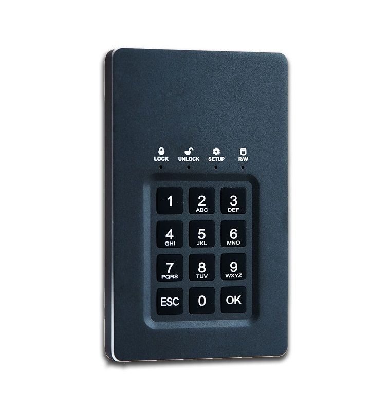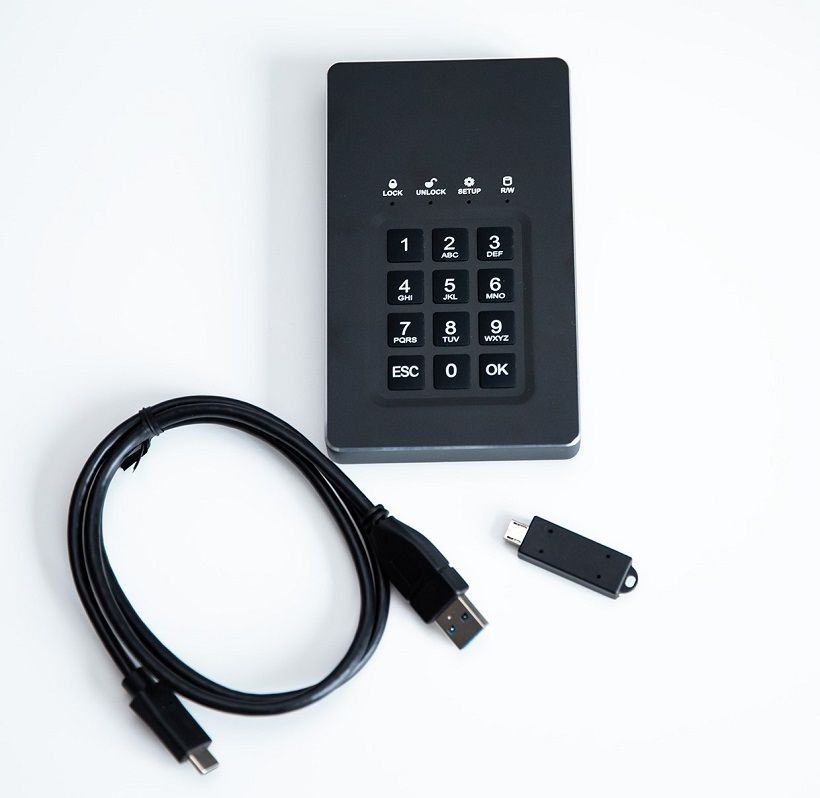 Компактный внешний накопитель имеет микропроцессор для шифрования данных на самом устройстве, что исключает перехват информации с помощью хакерских приложений. Аутентификация пользователя происходит с помощью кодового числа или слова. Износостойкая клавиатура располагается на корпусе диска GuardDo SSD 16 Тб, подбор пароля или его перехват приложениями типа keylogger абсолютно невозможен.