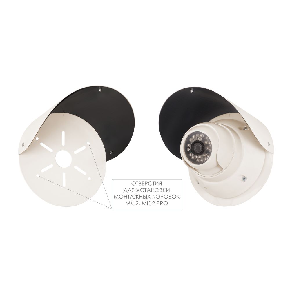 Защитный козырек предназначен для защиты от воздействия прямых солнечных лучей, попадания атмосферных осадков в виде дождя, снега, града и кусков льда на купольные видеокамеры с диаметром НЕ БОЛЕЕ 90 мм. Разработан специально ДЛЯ СОВМЕСТНОЙ УСТАНОВКИ С монтажными коробками МК-2 и МК-2 PRO от SLT, на которые можно крепить купольные видеокамеры. Из оцинкованной стали, устойчив к воздействию УФ-излучения. Устанавливается с помощью шурупов и резьбовых болтов, 160х140 мм.